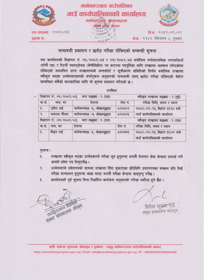 नामवली प्रकाशन र छनोट परिक्षा सम्बन्धी सूचना(सामी)।