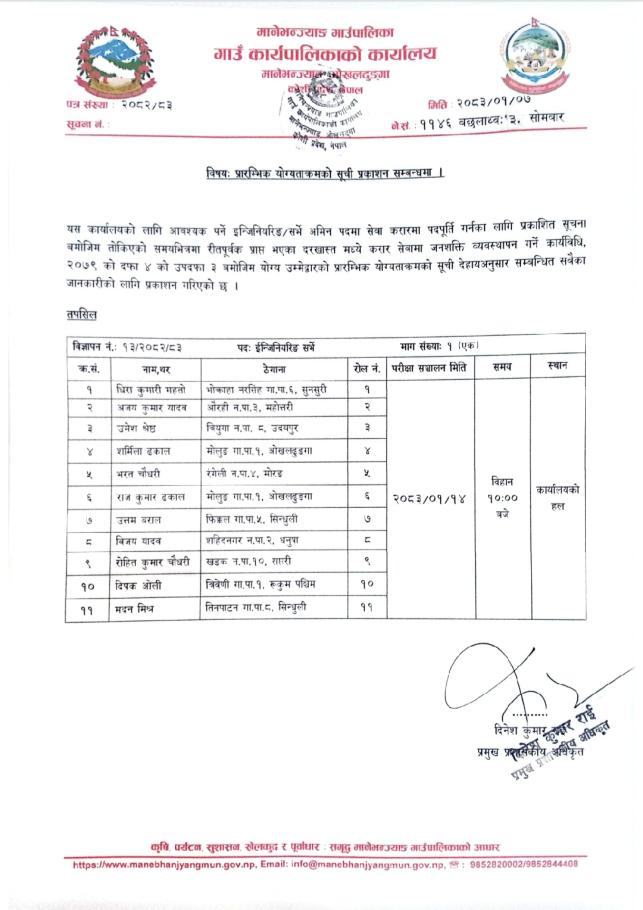 प्रारम्भिक योग्यताक्रमको सूची तथा परिक्षा मिति कायम गरिएको सम्बन्धि सूचना(अमिन)