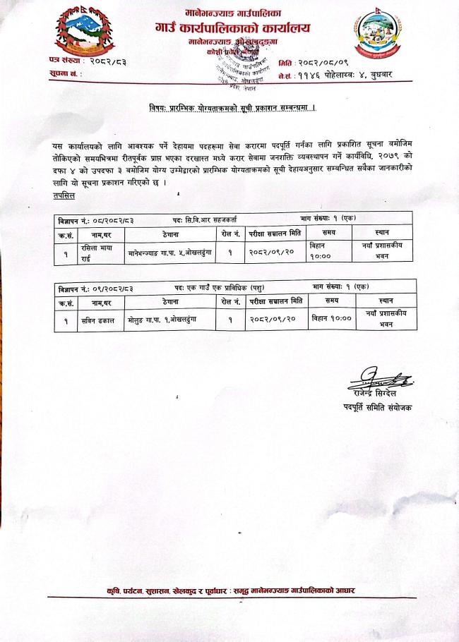 प्रारम्भिक योग्यताक्रमको सूची प्रकाशन सम्बन्धमा।