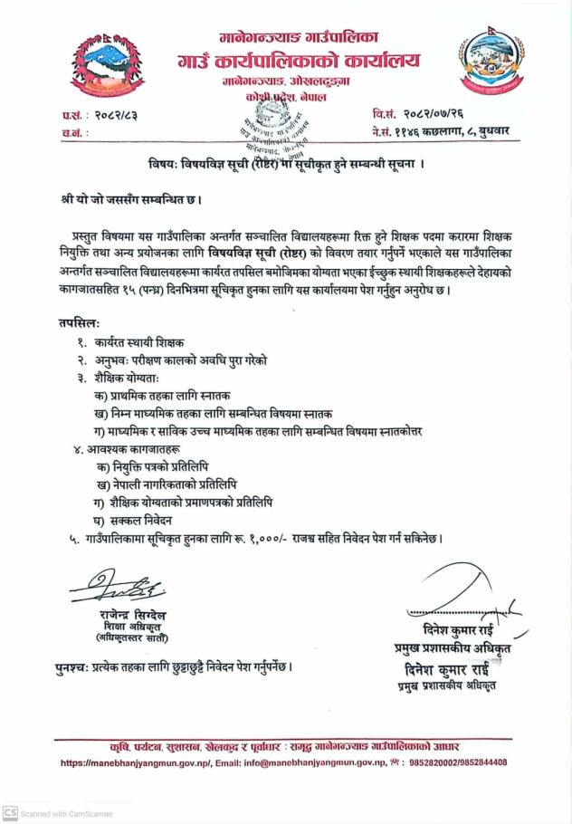विषयविज्ञ सूचि(रोष्टर)मा सूचिकृत हुने सम्बन्धी सूचना !