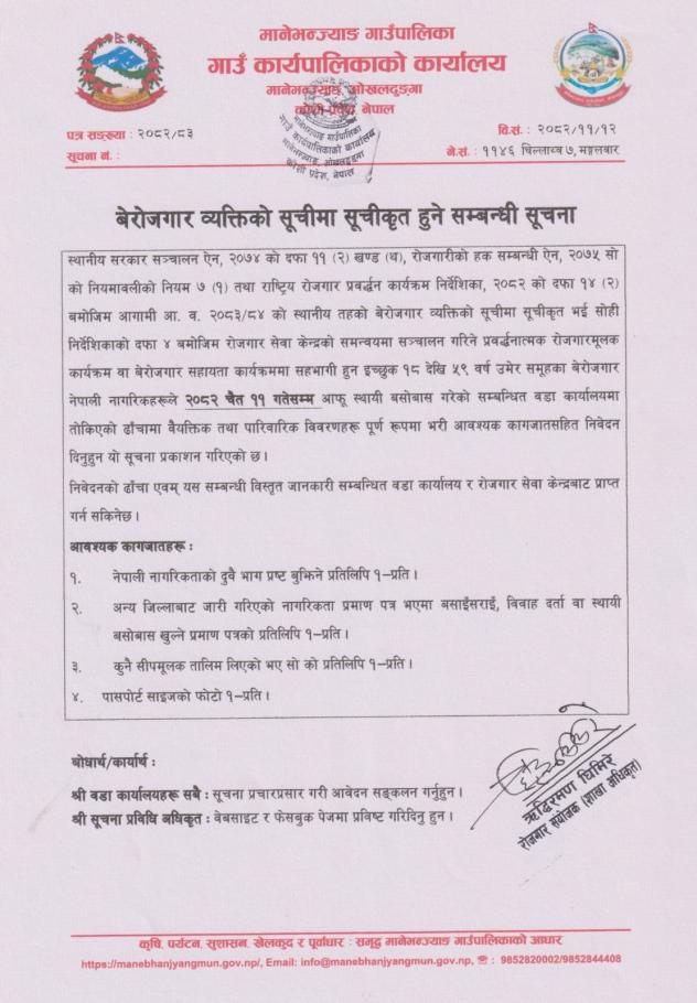 बेरोजगार व्यक्तिको सूचीमा सूचीकृत हुने सम्बन्धी सूचना